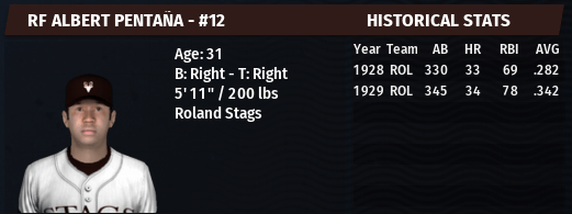 “The 1929 Uplantic Association awards have been presented. There was some controversy, as Roland’s Albert Pentana won the MVP when we all assumed Delle’s Antonio Teakowa would win the award, as he was just .020 BA points from a batting Triple Crown and tied the league record for home runs. It can’t be justified by pointing out the overall success of the Stags versus the Stars, since Ambroise Forestier won the award last year playing for the league’s worst team and the Stars were one of the last teams to be eliminated from contention this year, so it’s not like they were awful. It seems like Pentana’s pretty smile and fancy suits had a bigger influence on the writers who vote for MVP than Teakowa’s superior statistics and boring personality.” – Michael Grossman, Delle radio host