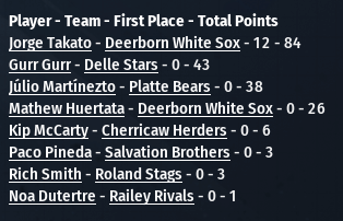 - The Taawa Chargers are under new ownership. After an absolutely dismal 31-69 season, Jorge Olufemi has sold the Chargers to Micah Thurman. Thurman comes from generational wealth in the coal mining industry in Kandelria. In the past Thurman has lobbied the Chargers to use his company’s branding in their promotional materials, which previous ownership declined to do. He has also expressed wishes to sell the rights to the names of pro stadiums and install advertising on the fields, so we may see a new name and look for Sapfoot Stadium in the coming years. Taawa is set to host the All-Star Game in 1930, which could serve as a showcase for new sponsorship deals under Thurman’s ownership. Thurman has stated that he values winning over all else, and that will be the only cure for the Chargers’ waning attendance over the first two seasons. (10/8)