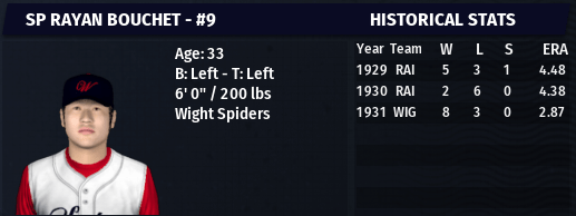 - The Wight Spiders make the first big splash in NPL free agency, signing RH RP Kevin Gomez for 1932. He has spent the last 4 years with the Deerborn White Sox in the UA, where he put up an impressive 0.76 ERA and 36 Ks over 35.1 innings in 1931. He is likely to take over as the Spiders’ closer in 1932. (10/5)