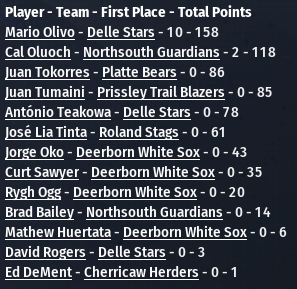- A big trade in the UA: The Northsouth Guardians have added one of the league’s top relievers, RHP Len Odden, in a trade with the Salvation Brothers. Salvation receives infield prospects Alix Gerard and Tony Sellimi. (10/24)