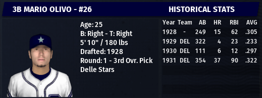 - 3B: Mario Olivo, Delle Stars: .322/.409/.692, 37 HR, 3 SB