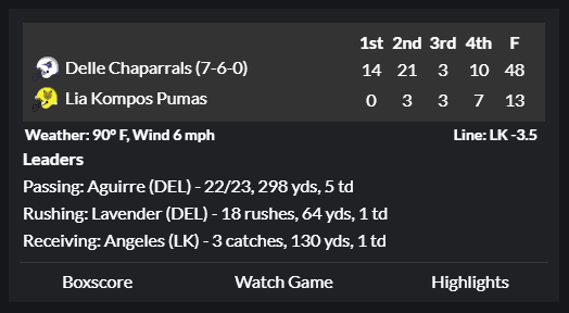 The Pumas won both Regular Season games between these teams, but the Chaparrals came to play this week. Delle struck first with 5 unanswered TDs to take a commanding 35-0 lead. They never looked back, stomping their conference rivals and punching their ticket to the Uplantic Bowl against the Athletics.