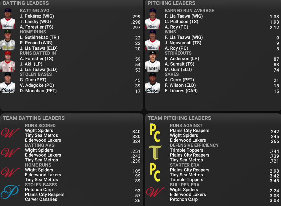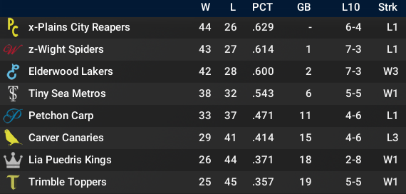 - Plains City outlasted Tiny Sea in a 16-inning epic that took nearly five hours. DH Mike Wilson drove RF Jose Gomez home with a walk-off double to seal a 4-3 win. The Reapers still lead the Spiders by 1 game with 2 games remaining.