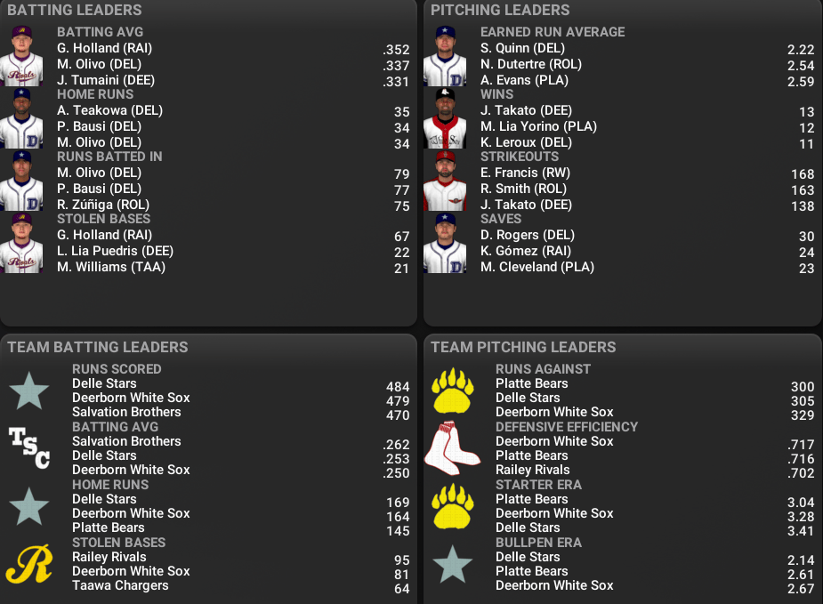 - Delle is having a blast, with an in-team race for the league home run title. Stars 1B Pedro Bausi tied teammate Mario Olivo with his 34th homer, but RF Anontio Teakowa hit his 5th HR in the last 4 games to leapfrog into the league lead. Delle beat Lia Kompos in a tater-fest, 9-8. The win give the Stars their first UA East Pennant and finalizes the UA Playoff field. The Bears will play the White Sox in the SemiFinal, and the winner will face the Stars for the Windsor Cup!