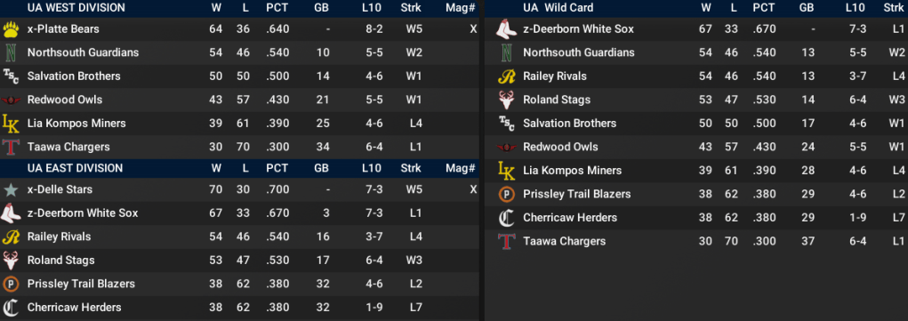 - White Sox RF Ivan Tuuwa went 3 for 5 with a HR and 4 RBI as Deerborn avoided a sweep in Delle, winning 8-5. They gain a game and now trail the Stars by 2 games with 9 games to go. Despite the loss, the Stars have officially claimed a playoff berth. They will at least win the Wild Card, but will attempt to hold on for their first division pennant and first Davis Trophy (UA Best Record).