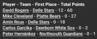 - C: Alejandro Lia Loma, Deerborn White Sox