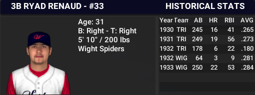 1933 NPL MVP: Ryad Renaud, 3B Wight Spiders (.284 AVG, 71 hits, 22 HR, 13 doubles, 1 triple, 53 RBI)