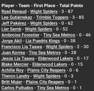 Ryad Renaud narrowly beat out Trimble’s Lee Gutierrekaz for MVP, winning by 2 total points. Both players received 3 first-place votes.