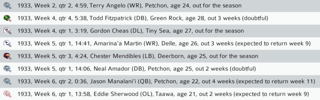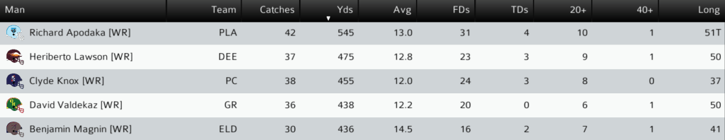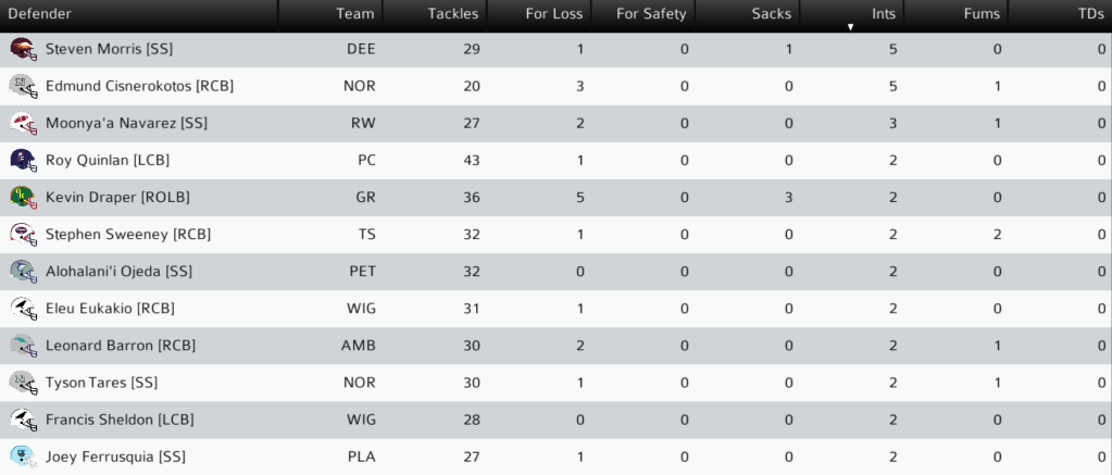 WIG (4-1) @ RW (0-5): Football’s worst team, the Redwood Flyers, hosted the Wight Ravens on Sunday night. The Flyers hadn’t scored a TD since Week 1, but QB Lemanea’a Gacharna broke that streak with a 34 yard pass to HB Mililani’i Sapp. The Flyers lost a heart breaker on a 52-yard FG by Ravens K Dalton Kandoro with 33 seconds to go. The win puts the Ravens in a tie with the Travelers for first place in the NC East. Final: WIG 15, RW 13.