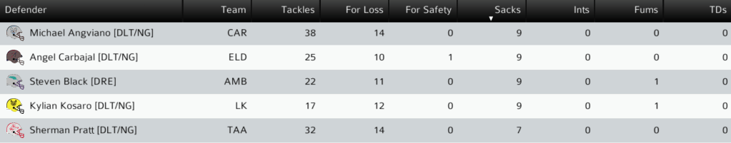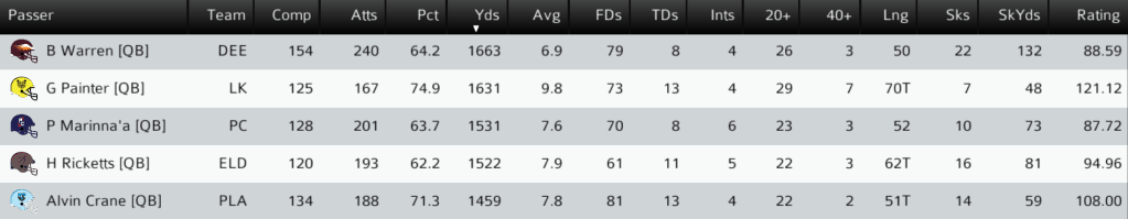 ELD (4-1) @ PC (4-1): The Elderwood Archers and the Plains City Travelers met in a clash between NC division leaders, with the NC’s best record on the line. It was a thrilling game, but the Travelers couldn’t overcome QB Phillip Marinna’a’s 4 INTs, the last of which came in the final minute and put a dagger in Plain’s City’s hopes of a comeback. The Archers win their 4th straight game and hold the top record in the conference. Final: ELD 20, PC 17.