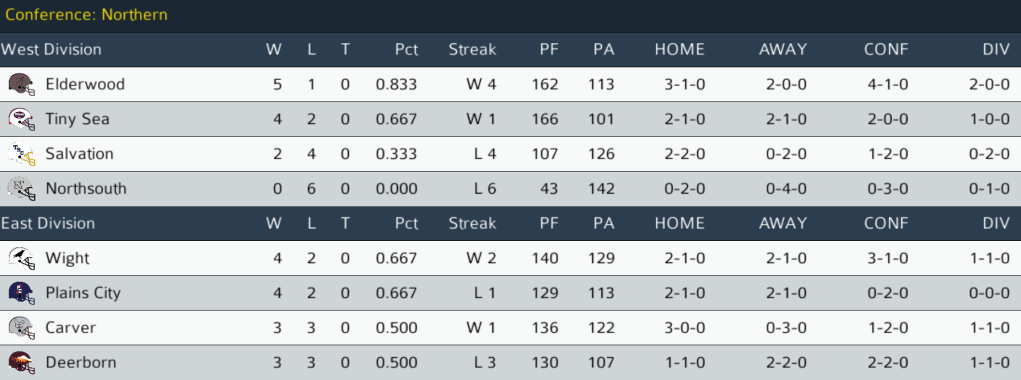 TS (3-2) @ SAL (2-3): Crosstown rivals, the Tiny Sea Titans and the Salvation Brothers. The Titans rebounded after last week’s loss with a sound Monday night win at the City Center. Tiny Sea outperformed Salvation by nearly 100 yards on offense. Titans QB Leland James passed for 200 yards and 3 TDs. Tiny Sea remains a game behind Elderwood in the NC West, while the Brothers in freefall with their 4th straight loss. Final: TS 32, SAL 10.