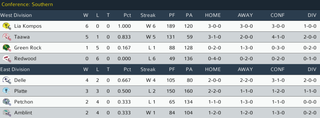 In Week 6, the Lia Kompos Pumas looked to remain unbeaten against the Deerborn Gryphons, while Northern Conference division leaders Elderwood and Plains City met in a showdown for the NC’s best record. In the SC East, the Chaparrals and Cragsmen squared off for first place in Platte.