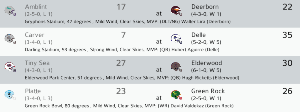 AMB (2-4) @ DEE (3-3): The Deerborn Gryphons recorded a solid win at home against the Amblint Poets. The Gryphons snap a 3-game losing streak. DL Walter Lira had 4 sacks on 7 tackles in the win. Final: DEE 22, AMB 17.