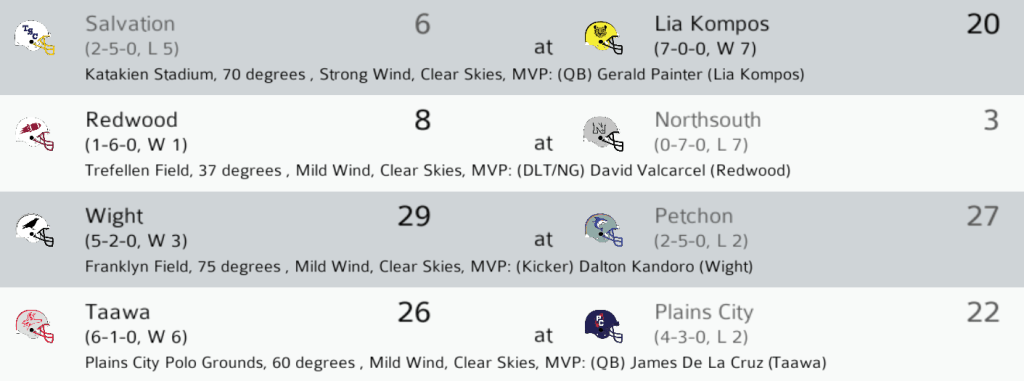 WIG (4-2) @ RW (2-4): The Wight Ravens won a tight contest against the Predators in Petchon. The Ravens overcame a Predators fourth quarter comeback with K Dalton Kandioro’s 5th FG of the game, a 47-yard attempt as time expired. Wight retains a slim lead in the NC East. Final: WIG 29, PET 27.