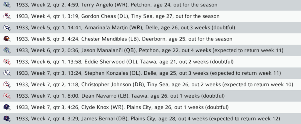 A handful of injuries this week could affect some top teams as they vie for playoff positions, most notably Travelers WR Clyde Knox (doubtful for Week 8), Titans DB Christopher Johnson (expected back in Week 10), and Jackals LB Dean Navarro (doubtful for Week 8).