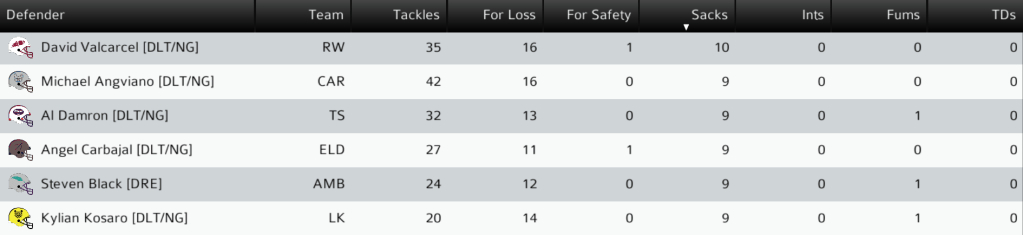 RW (0-6) @ NOR (6-0): In a battle of winless teams, the Redwood Flyers and Northsouth Generals lived up to the “worst teams” hype. In a game without a touchdown on either side, the Flyers staked their claim as the second-worst team in the league. Redwood DL David Valcarcel had 4 sacks on 7 tackles, one of which was for a safety as time expired in the game. Final: RW 8, NOR 3.