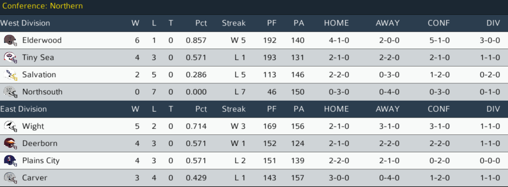 TS (4-2) @ ELD (5-1): The Tiny Sea Titans traveled to Elderwood to take on the Archers in an NC West showdown. A thrilling back-and-forth game ended in an Archers win on a 9-yard pass from QB Hugh Ricketts to WR Glen Lloyd after an impressive 9-play drive in the final two minutes. Elderwood has the top record in the Northern Conference at the midway point in the season. Final: ELD 30, TS 27.