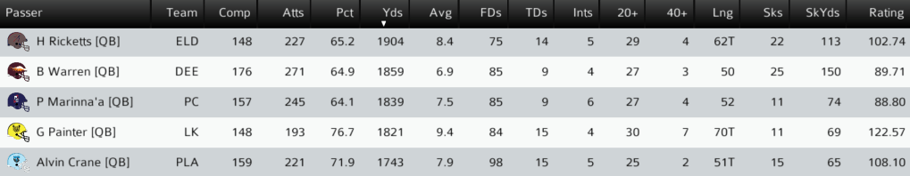 TAA (5-1) @ PC (4-2): The Taawa Jackals went to Plains City to play the Travelers at the Polo Grounds. The Jackals held on in a tight contest for their sixth straight win. They remain a game back of the unbeaten Pumas in the SC West. The Travelers fall a game behind the Ravens in the NC East. Taawa QB James De La Cruz threw for 268 yards and a TD in the win. Final: TAA 26, PC 22.
