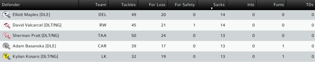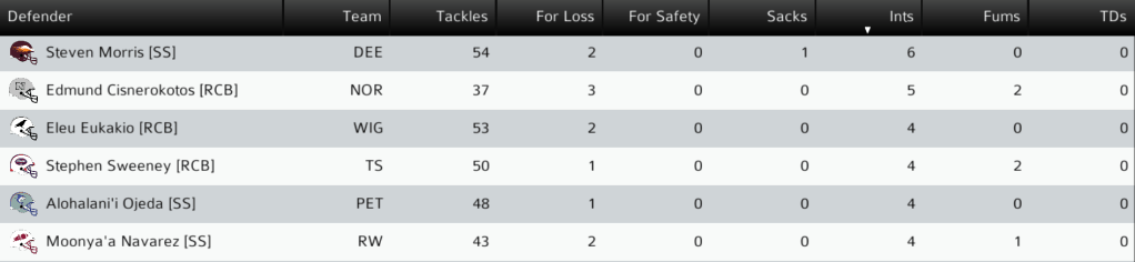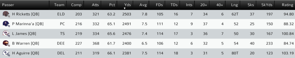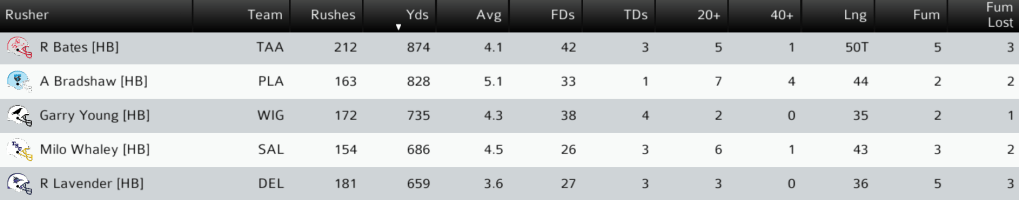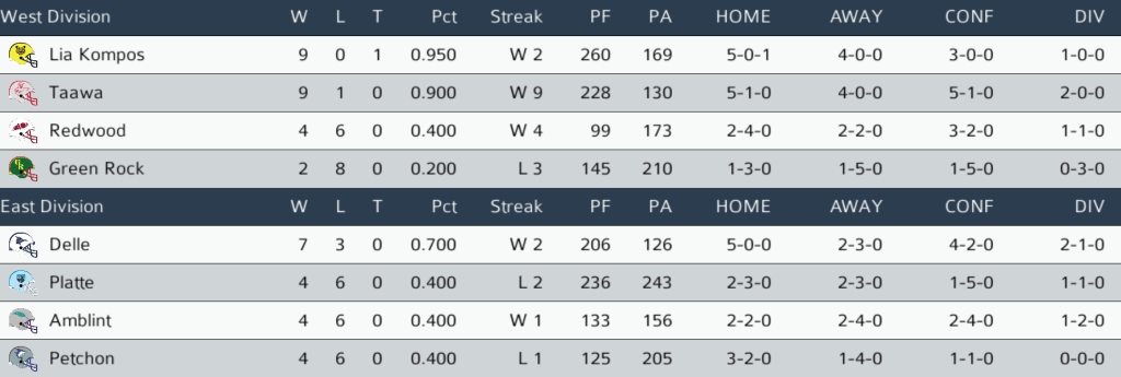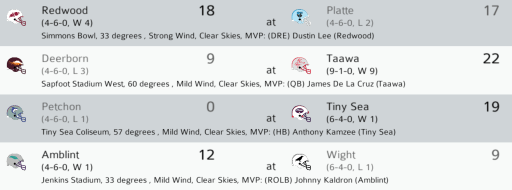 DEE (4-5) @ TAA (8-1): The Taawa Jackals cruised to their 9th straight win against the Deerborn Gryphons at Sapfoot Stadium West. Jackals HB Rickie Bates rattled off 123 yards on 24 carries. He leads the league in rushing yardage. Taawa QB James De La Cruz threw for 255 yards and 2 TDs in the win. Taawa remains just a half game back of the unbeaten Pumas in the SC West. Final: TAA 22, DEE 9.