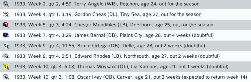 CAR (5-4) @ NOR (0-9): The Carver Bulldogs hoped to keep pace in the NC East as they played the Generals in Northsouth. The Bulldogs dominated the Generals, but lost starting QB Oscar Ivey to injury in the third quarter. Backup Frank Daugherty narrowly lost the starting job to Ivey in the preseason, so the Bulldogs are confident he can help lead them to a division title. Final: CAR 23, NOR 3.