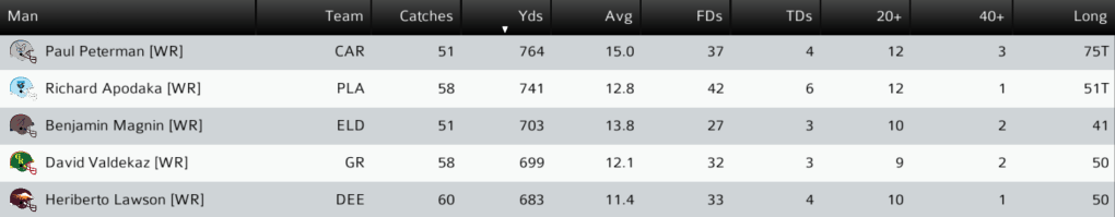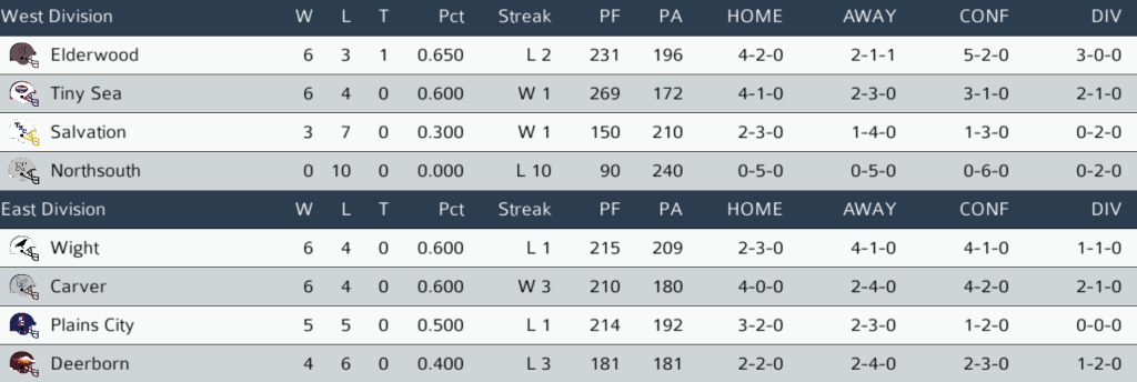 AMB (3-6) @ WIG (6-3): The Wight Ravens hosted the Amblint Poets this week. In a sloppy game, Amblint QB Sean Trask’s 4-yard pass to TE Robert Rosen was the only touchdown. Amblint held on for an upset win on the road. With the loss, the Ravens are now tied for first with the Carver Bulldogs in the NC East. Final: AMB 12, WIG 9.