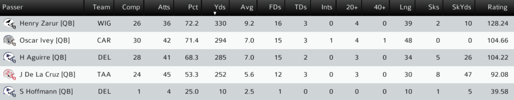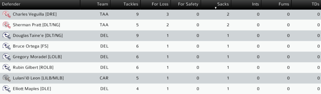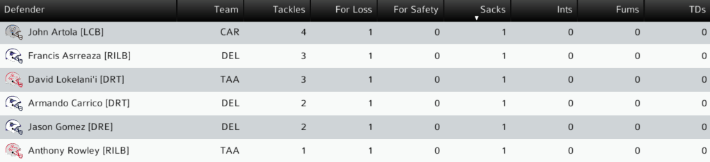 TAA (11-3) @ DEL (10-4): In the SC Wild Card game, the top two defenses lived up to the hype, forcing a combined 19 punts between the two teams. The Chaps finally scored the game’s first touchdown late in the third quarter on a 12-yard run by HB Anthony Gasporra, and the Chaps led 14-3 heading into the final quarter. Trailing by a touchdown, the Jackals got the ball back with just under 3 minutes to go. Taawa QB James De La Cruz converted on 4th and 11 with a 30-yard completion to TE David Morva, then tied the game with a 25-yard pass to WR Vagana’a Sanchez. In overtime, the Chaps scored on their first possession with a 9-yard TD pass from QB Hubert Aguirre to TE Tyrone Washington, but failed to convert the mandatory 2-point attempt as Taawa DE Charles Veguilla picked up his 2nd QB sack of the day. Taawa scored on an 18-yard De La Cruz pass to WR Peter Cody, and won the game with a 2-point run by HB Rickie Bates. The Jackals win the first overtime game in UPF history and advance to the SC Championship against their division rivals, the Lia Kompos Pumas. Final: TAA 29, DEL 27 (OT).