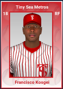 The Tiny Sea Metros made some substantial moves to shore up their roster for their first season in the UA. Their biggest pickup was 4-time All-Star LH SP Jeff Walker, from the crosstown rival Brothers. His last season with Salvation was a bit off his career pace, but still quite productive. They also added free agent RH CL Len Odden (4-time All-Star) to their bullpen, along with free agent RHP Jeremy Wheeler (1932 All-Star) from the Stars. Power-hitting veteran OF Francisco Kosgei came over as a free agent as well.