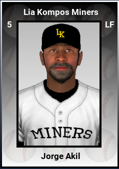 The Lia Kompos Miners lost stars SS Jose Meza, 1B Jaime Karrika, RF Ron Morley, and CF Steve Kiteoko as part of a big rebuild this winter. To make up for it, they added some big performers. They signed free agent OF Jorge Akil, a power-hitting 39-year old veteran and baseball legend, 5-time All-Star 1B Roman Zuniga, and 3-time All-Star, veteran base-stealing star Ed DeMent.