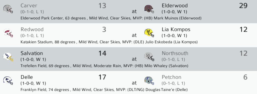 CAR (0-0) @ ELD (0-0): The Elderwood Archers opened with a convincing win against fellow 1933 division champs, the Carver Bulldogs. Archers HB Mark Muinos rushed for 105 yards and a TD on 20 carries and QB Hugh Ricketts threw for 338 yards and a TD in the win. Final: ELD 29, CAR 13.