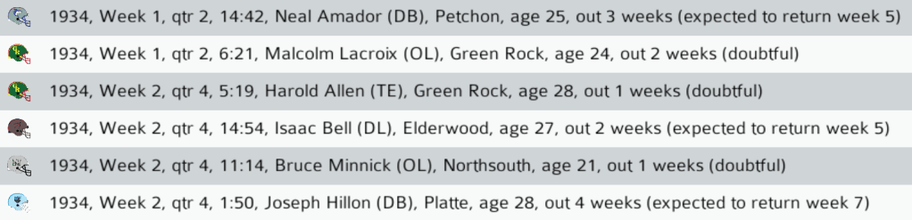 ELD (1-0) @ NOR (0-1): The Northsouth Generals faced a tough opponent at home with the Elderwood Archers in town. The Generals, still looking for their first franchise win, led the Archers 13-3 in the first half, but Elderwood rattled off 3 TDs in the last 7 minutes of the second quarter. Rookie QB Quincy Medina and HB Olin Nelson fought hard to keep the Generals in the game during the second half, but the Archers held on to win by a touchdown. Final: ELD 30, NOR 23.
