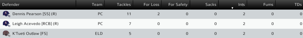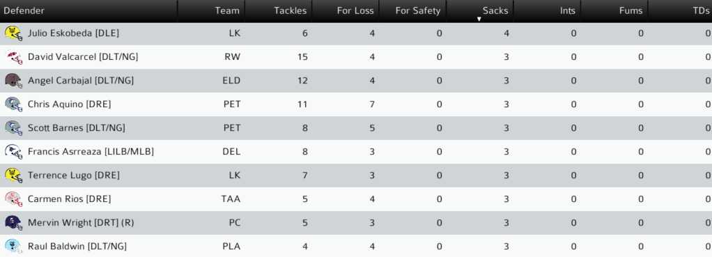 RW (0-1) @ PET (0-1): The Redwood Flyers traveled to Franklyn Field to play the Petchon Predators with both teams looking to bounce back from losses in Week 1. Rookie Petchon QB Leslie Rambuka’a had a strong outing with 226 yards, 2 TDs, and an INT. Landon, Komulada, and Long combined for 76 rushing yards. LB Michael Bogan had an INT and 2 sacks on 6 total tackles. Final: PET 17, RW 9.