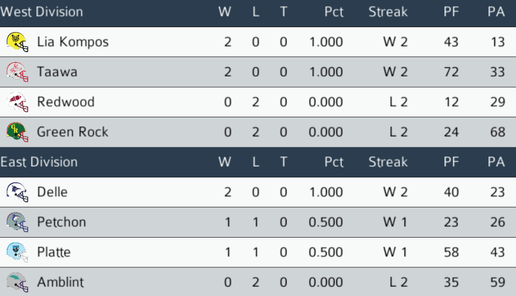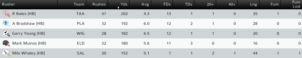 WIG (1-0) @ TS (1-0): The Wight Ravens headed to Tiny Sea to take on the Titans. The Titans relied on their running game, particularly on HB Anthony Kamzee who was brilliant with 141 yards on just 19 carries. Overall, the Titans combined for 157 yards on the ground. Wight HB Garry Young had a good day as well, with 110 yards on 18 rushes, but the Ravens were unable to get much going for most of the second half and fell short of a comeback. Final: TS 20, WIG 17.