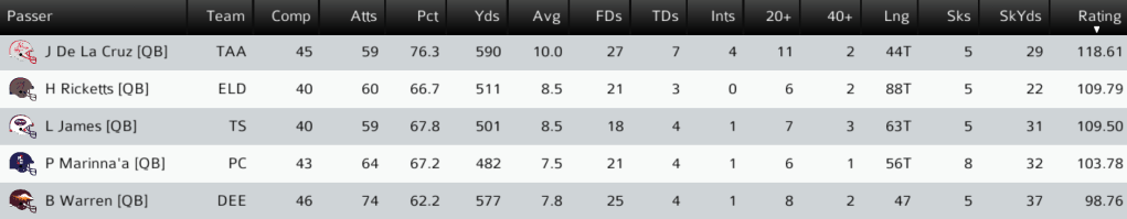 TAA (1-0) @ AMB (0-1): The Taawa Jackals rode to a swift victory over the Amblint Poets at the Woover Bowl. Taawa QB James De La Cruz was confident, throwing for 257 yards and 3 TDs. De La Cruz threw 2 INTs, but the Jackals cruised to another win, with HB Rickie Bates rushing for 118 yards on 23 carries. Jackals DE Carmen Rios recorded 2 sacks in the game. Final: TAA 35, AMB 19.