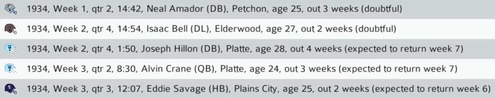 PLA (1-1) @ DEE (2-0): The Platte Cragsmen visited the Deerborn Gryphons on Sunday. The Cragsmen suffered a tough loss with QB Alvin Crane leaving in the second quarter with a concussion. Backup QB Jermaine Powers struggled to connect with receivers early on and threw 2 INTs, but ultimately led an incredible 17-point fourth quarter comeback in which the Cragsmen won on a 28-yard FG by K Dennis Peebles. Rookie Platte SS Frank Talvavera intercepted 2 passes and recorded 9 tackles in the win. Bad news for Platte: Alvin Crane will likely miss 3 weeks due to his head injury. Final: PLA 23, DEE 20.