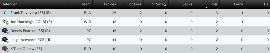 CAR (0-2) @ WIG (1-1): After losses against tough teams in the first two weeks, the Carver Bulldogs visited the Wight Ravens in a big division game in the rain. The Bulldogs led by 11 at halftime, but the Ravens kept them from scoring the second half. Rookie LB Joe Hutchings had a tremendous day for Wight with a fumble recovery and an INT that he returned for a TD. The Bulldogs remain winless in a difficult division as the Ravens move into a first-place tie with the Gryphons. Final: TS 20, WIG 17.