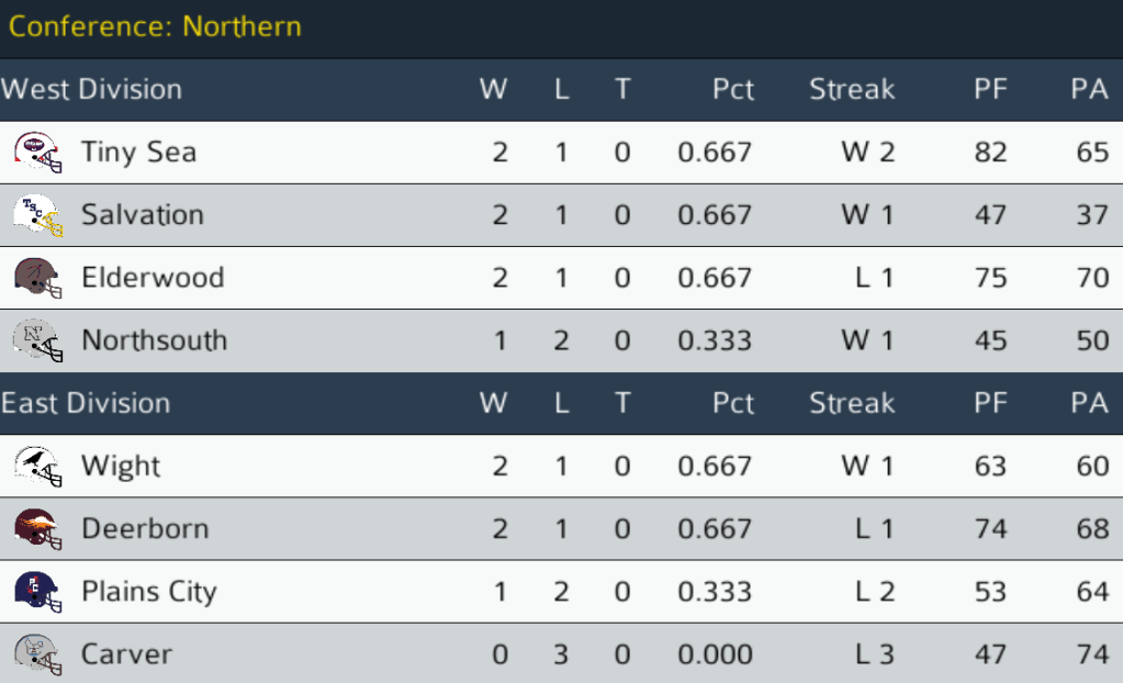 ELD (2-0) @ TS (1-1): The Elderwood Archers looked to stay unbeaten as they took on the Tiny Sea Titans on the road. Tiny Sea HB Anthony Kamzee had another good outing, rushing for 79 yards and 2 TDs on 15 carries and making 2 catches for 29 yards. QB Hugh Ricketts played well for the Archers, passing for 274 yards and a TD and rushing for 55 yards more. However, the day belonged to the Titans, who beat up on the Archers for a surprising blowout win. There is now a three-way tie for first in the NC West between Elderwood, Salvation, and Tiny Sea. Final: TS 34, ELD 16.