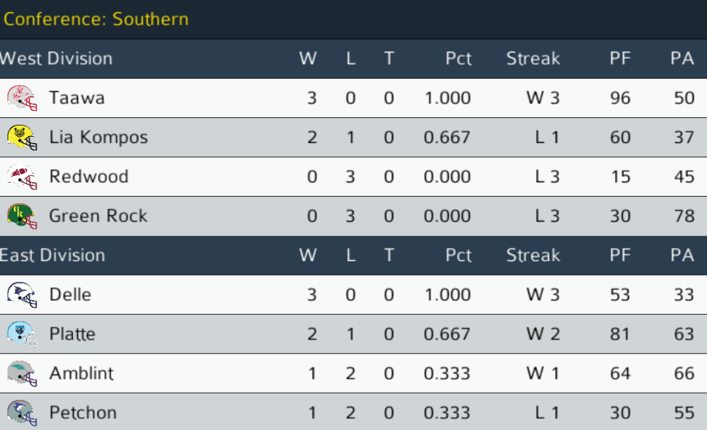 NOR (0-2) @ GR (0-2): Two winless teams met in Green Rock, with the Warriors hosting the Northsouth Generals. In a low-scoring affair, the Generals managed to come out on top for their first-ever franchise win. Generals LB Edward Rhodes racked up 11 tackles in the game, as Northsouth finally put a tick in the win column in their second season. Final: NOR 10, GR 6.