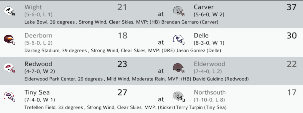 RW (3-7) @ ELD (7-3): The first-place Elderwood Archers hosted the Redwood Flyers in a cross-conference match-up. It was a chilly, rainy day at Trefellen Field. The Flyers played tough against the heavily-favored Archers and scored on 3-yard David Guidino TD run with 12 seconds left to take a shocking upset victory. The Archers have lost two straight games to sub-.500 teams and are now tied for first place in the NC West. Final: RW 23, ELD 22.