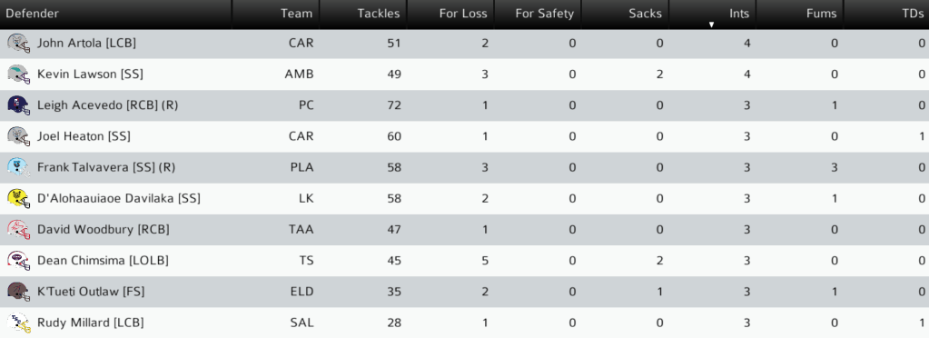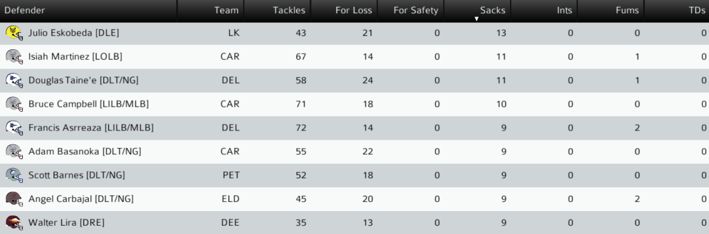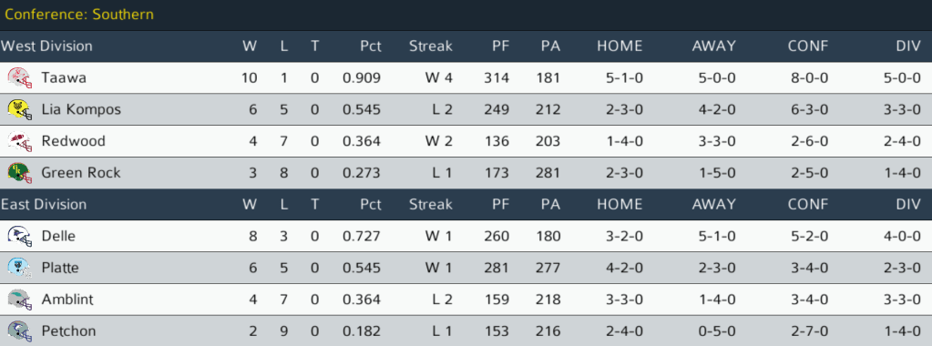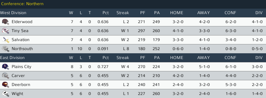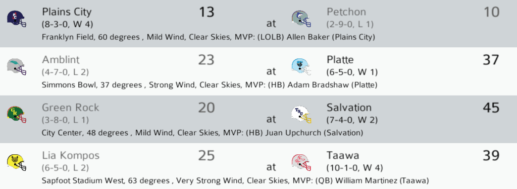 PC (7-3) @ PET (2-8): The Petchon Predators hosted the Plains City Travelers. The Travelers looked to extend their NC East lead against a Predators team that came into the game flying high after achieving a blowout upset last week. Petchon led narrowly for the entire game until Plains City QB Phillip Marinna’a led a scoring drive with 1:53 to go, ending with a 15-yard pass to WR Clyde Knox to give the Travelers the win. LB Allen Baker had a sack on 8 total tackles for Plains City. The Travelers now hold a 2-game lead in the NC East and the Northern Conference’s best record at 8-3. They can secure the NC East title next week at home against Carver. Final: PC 13, PET 10.