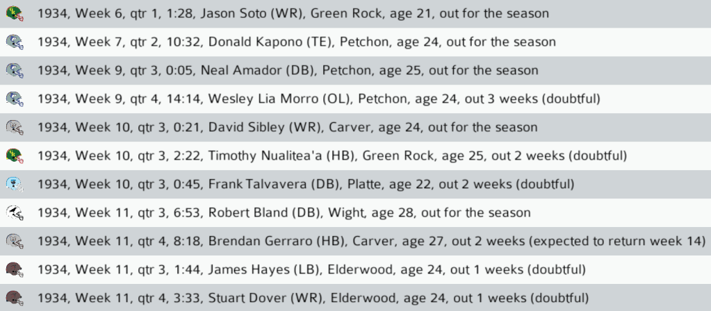 TS (6-4) @ NOR (1-9): The Tiny Sea Titans traveled to Northsouth to take on the Generals. Titans K Terry Turpin made 4 FGs in the contest. Tiny Sea left rookie Northsouth QB Quincy Medina sore with 6 QB sacks as the Titans took the victory to move into a tie for first place in the NC West. Final: TS 27, NOR 17.