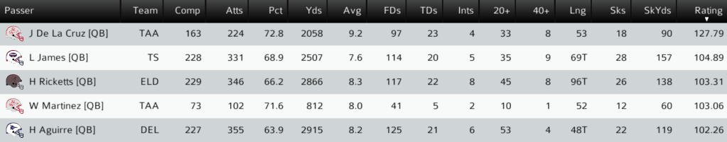 DEE (5-5) @ DEL (7-3): After starting 7-0 and then losing 3 straight games, the Delle Chaparrals looked to get back on track at home against the Deerborn Gryphons. Chaps QB Hubert Aguirre briefly left the game twice, but was able to return at full strength to lead the tea, with 366 passing yards, 2 TDs and 2 INTs. HB Robert Lavender ran for 91 yards as Delle returned to the win column in a strong effort. Delle DE Jason Gomez had 4 sacks in the win. Final: DEL 30, DEE 18.