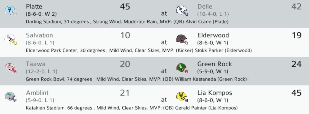 DEE (5-7-1) @ PC (10-3): The Plains City Travelers hosted the Deerborn Gryphons. Plains City looked to tune up before their playoff bye next week, while the Gryphons hoped for consolation at the end of a dismal season. Deerborn took the lead early in the fourth quarter, but Travelers K Donnie Scanlon nailed a chip shot FG to tie the game with 28 seconds left. The game ended in a tie. Travelers QB Phillip Marinna’a threw for 313 yards and 2 TDs, but couldn’t get the win to end the season. They will host the NC Championship game at the Polo Grounds in two weeks. Final: PC 17, DEE 17.