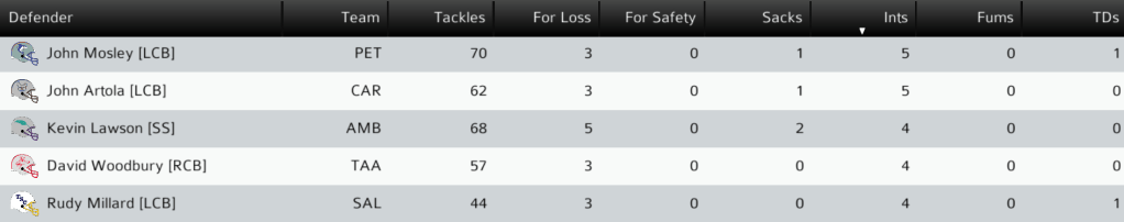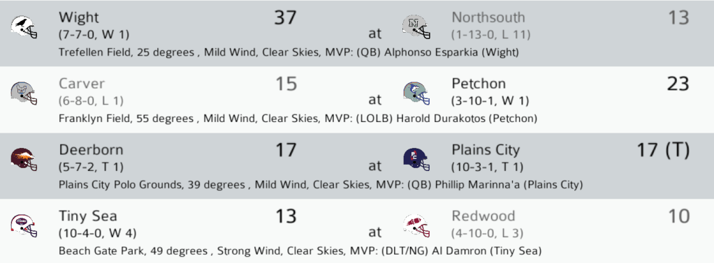 CAR (6-7) @ PET (2-10-1): The Carver Bulldogs visited the Petchon Predators. Carver hoped to end with a .500 record after a disappointing season. Carver QB Oscar Ivey had a rough day with 3 INTs. The Predators came away with a strong win to end the year. Petchon LB Harold Durakotos recorded 3 sacks on 9 total tackles in the game. Final: PET 23, CAR 15.