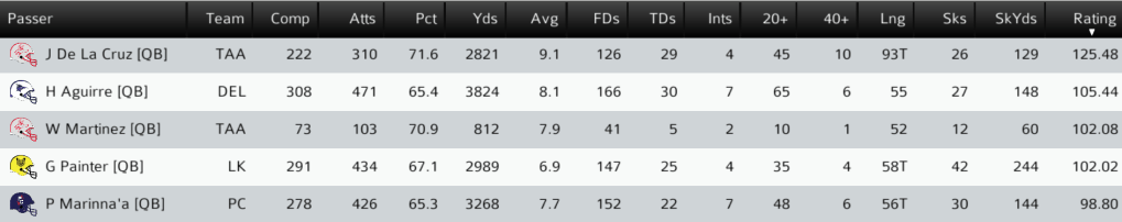 TAA (12-1) @ GR (4-9): The Taawa Jackals visited the Green Rock Warriors. Taawa looked to tune things up with a week off for the Wild Card Playoffs before they will host the SC Championship game in two weeks. Presumptive league MVP QB James De La Cruz struggled a bit compared to his usual level of play but was still good for 198 yards and a TD in the air and 45 yards on the ground. Warriors QB William Kastaneda was brilliant, throwing for 308 yards and 2 TDs. Green Rock shocked the Jackals, pulling off a comeback for the upset win. The result has no effect on the playoff seedings, but the loss may show future opponents a hitherto unknown weakness in the Jackals strong exterior. Final: GR 24, TAA 20.