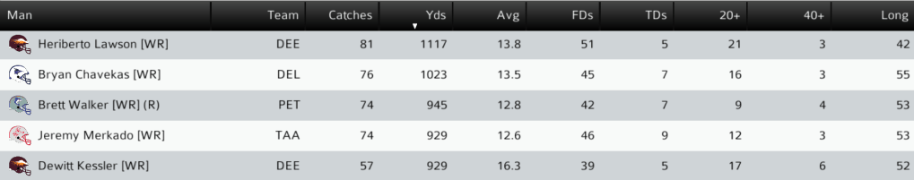 TS (9-4) @ RW (4-9): The Redwood Flyers hosted the NC West champion Tiny Sea Titans to end the year in a game with no playoff implications. Tiny Sea QB Leland James had an off-day with 2 INTs on 202 yards and a TD. Titans DL Al Damron had 4 sacks in the game as Tiny Sea held off the Flyers for a narrow win. Unfortunately, Tiny Sea lost two major defensive pieces as DL Daniel Burgos and DB Roy Gilles will miss the playoffs with injuries. The Titans will host the Archers in next week’s SC Wild Card game. Final: TS 13, RW 10.