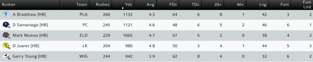 PLA (7-6) @ DEL (10-3): The Platte Cragsmen traveled to Delle to play the Chaparrals. Delle had already locked up the 2nd seed in the playoffs. Platte needed a win in this game and for Lia Kompos to lose or tie against Amblint to clinch the SC Wild Card. In a wild barn-burner, the Cragsmen came out swinging, riding a 21-point second quarter to a big lead. The Chaps came roaring back in the fourth quarter to come within 3 points, but eventually ran out of time in their comeback effort. Delle QB Hubert Aguirre had a huge game with 463 passing yards and 5 TDs. Platte QB Alvin Crane also played well with 380 passing yards, 5 TDs, and 1 INT. The Cragsmen came out on top and awaited the outcome of the Pumas/Poets game to learn their playoff fate. Platte HB Adam Bradshaw finished with 1132 rushing yards on the season for the 1934 Rushing Title! Final: PLA 45, DEL 42.