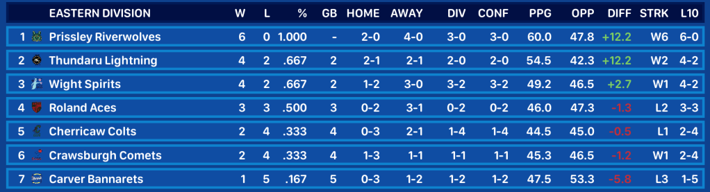 - The Thundaru Lightning notched another huge win, beating Railey 67-35. The Lightning are tied with the Riverwolves for the highest average point differential in the league at +12.2 ppg. Thundaru G Theodore Duncan had another big night, dropping 22 points with 3 rebounds, 2 steals, and an assist. The Lightning are 4-2, 2 games behind the Riverwolves in the Eastern Division.