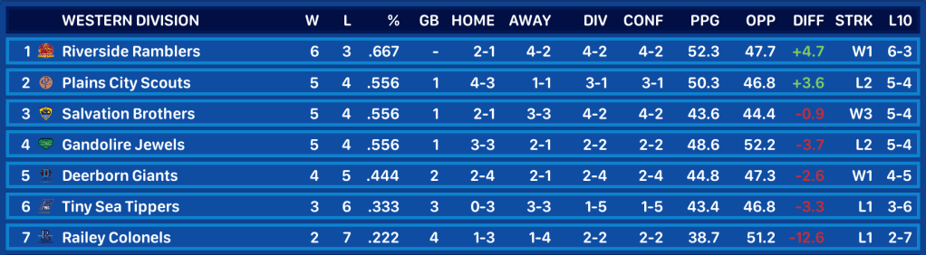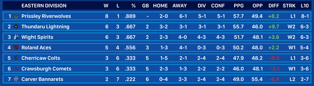 Week 3 of the UMB season began with the Prissley Riverwolves as the league’s only remaining undefeated team at 6-0, leading the Eastern Division.