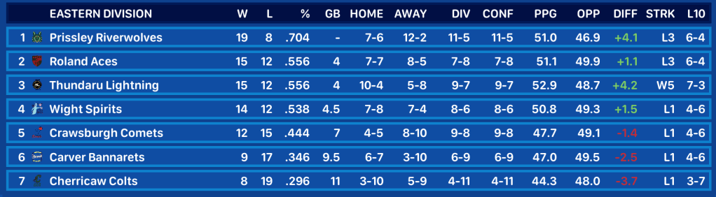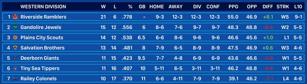 With the All-Star Game in the books, we now turn our attention to the playoff race. UMB’s season has just a few weeks left before the playoffs begin. No teams have been mathematically eliminated yet; the Ramblers, Jewels, and Scouts are atop the West and the Riverwolves, Aces, and Lightning lead the East. The Spirits, Brothers, Comets, and Giants are on the playoff bubble as we enter the final stretch of the Regular Season.