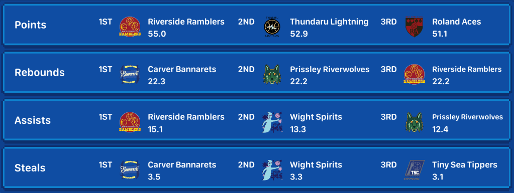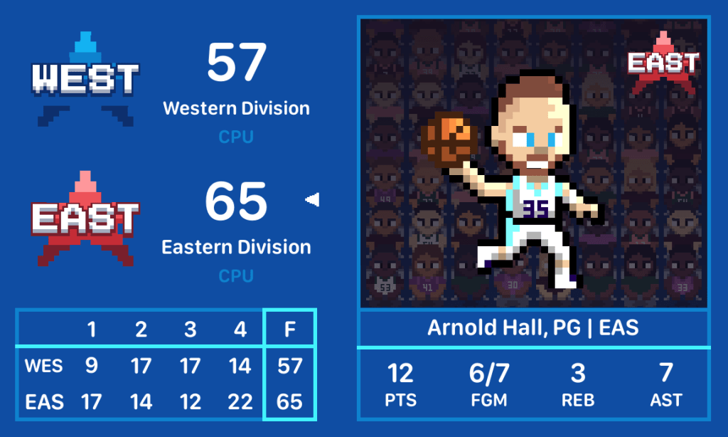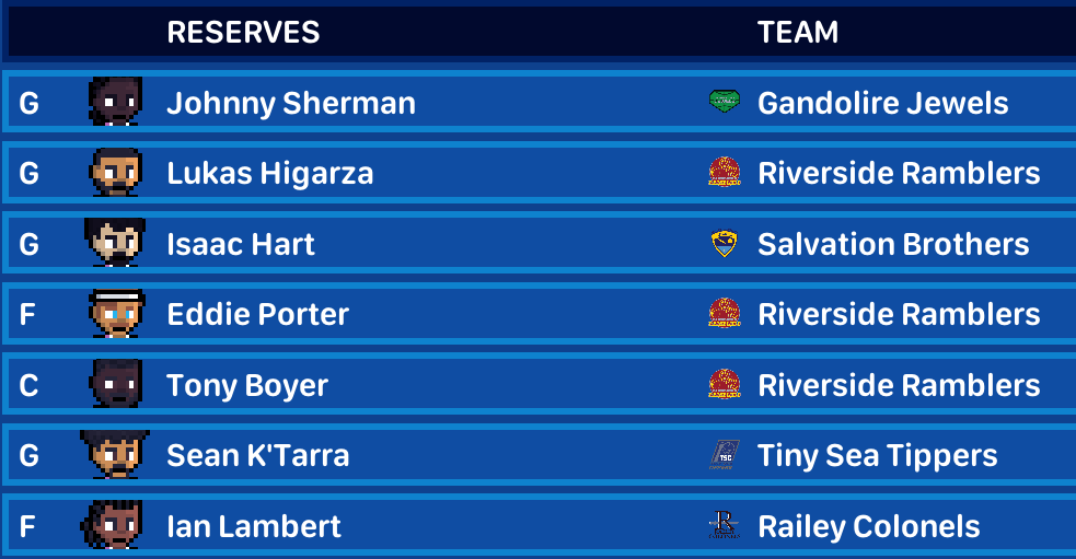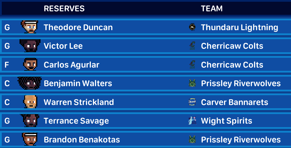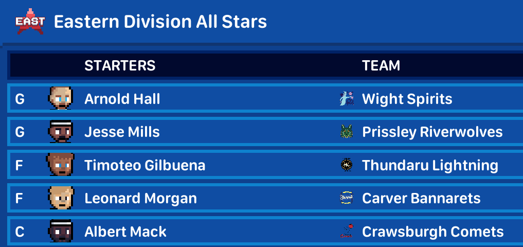 The UMB league office released the All-Star Rosters in the week leading up to the game. Unsurprisingly, UMB’s top team, the Riverside Ramblers, led the league with four All-Star selections in the West, including starting guard Luther James. The hosting Prissley Riverwolves sent three players to the game, including UMB’s leading scorer Jesse Mills who started for the East. The Plains City Scouts were the only team with two All-Star starters, as F Raymuno Moraltes and C Shaun Burgess both made the starting five for the West.
